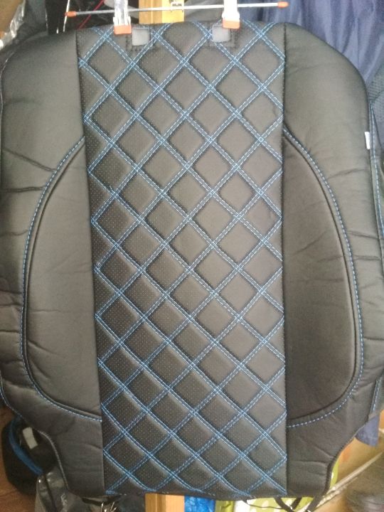 Модельные чехлы (КОМПЛЕКТ) из экокожи черные с прострочкой двойной синий ромб для Рено Логан до 2014г Комплектность: чехлы на передние сидушки и спинки, задняя спинка, задний диван, подголовники